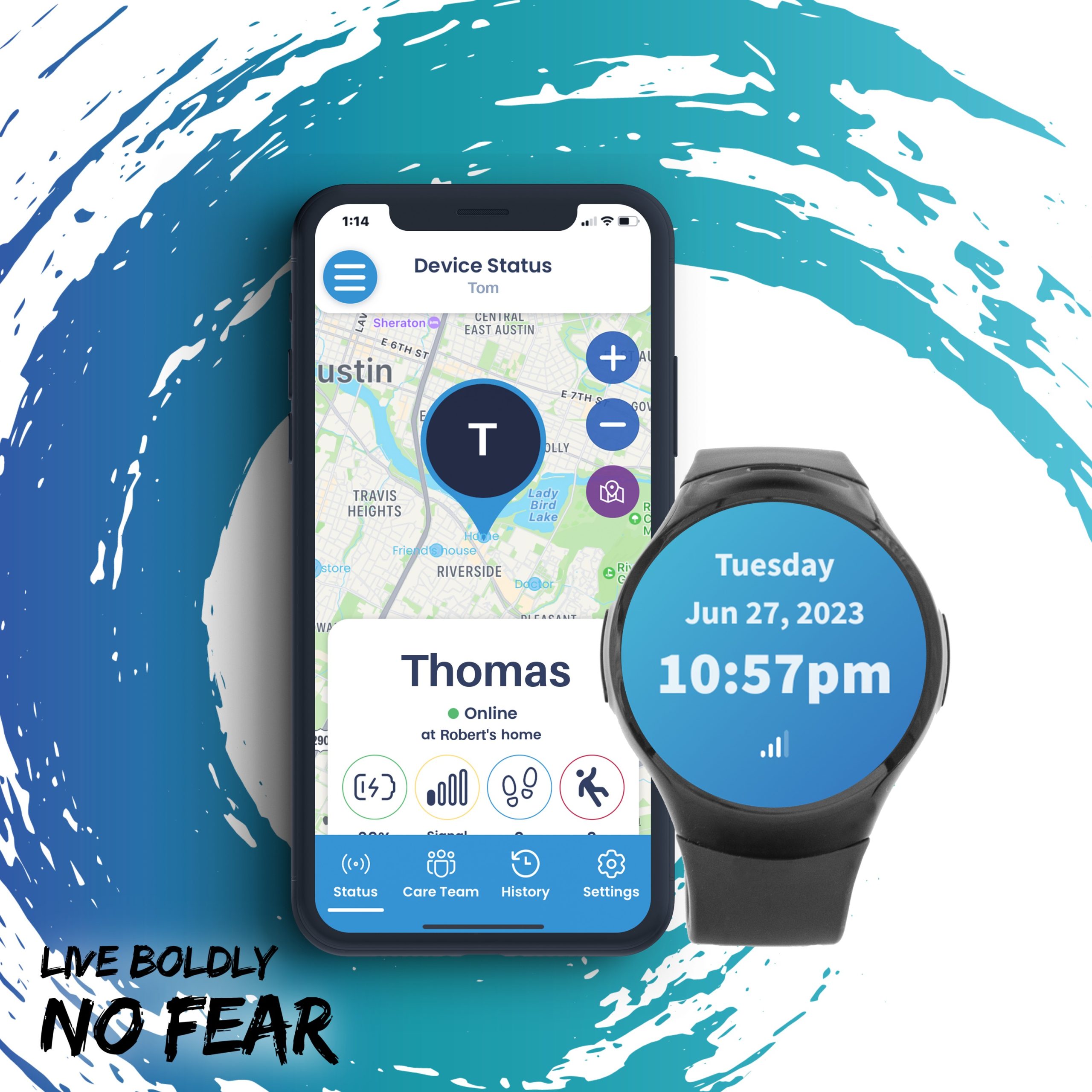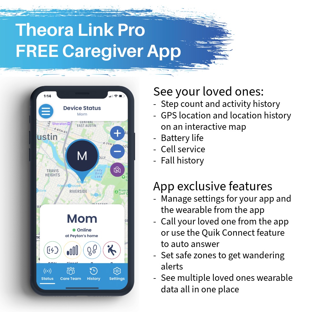 This stylish watch packs a punch – it’s a state-of-the-art GPS tracking watch with AI-powered Smart Fall Detection™, and automatic 2-way voice communications with the wearer (no button pushing required). Theora Connect™ provides location information, direct communications, enhanced peace of mind for caregivers, and independence for their care recipients. Combined with the Theora Link Pro™ Smartphone App for caregivers (smartphone not included), the Theora Connect is a smartwatch that comes already activated with apps for activity tracking, weather, and GPS location tracking, all packed into an attractive wearable watch. Theora Connect provides AI/Neural Network-driven, highly accurate, Smart Fall Detection™ to minimize false positives while providing enhanced peace of mind for caregivers and independence for their care recipients. Smart Fall Detection is an optional monthly subscription that can be added or removed at any time by calling our support team at (512)-371-6164.